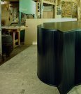 Véritable table de désorientation par les mots se présente comme un grand volume de bois noir à la forme complexe, combinant un cercle avec un quadrilatère prolongé par des parois reprenant le principe du rideau à lamelles coulissant. Je la voulais aussi opaque que la sculpture égyptienne en granite qui rentre sa masse dans un dessin qui lui colle à la peau.