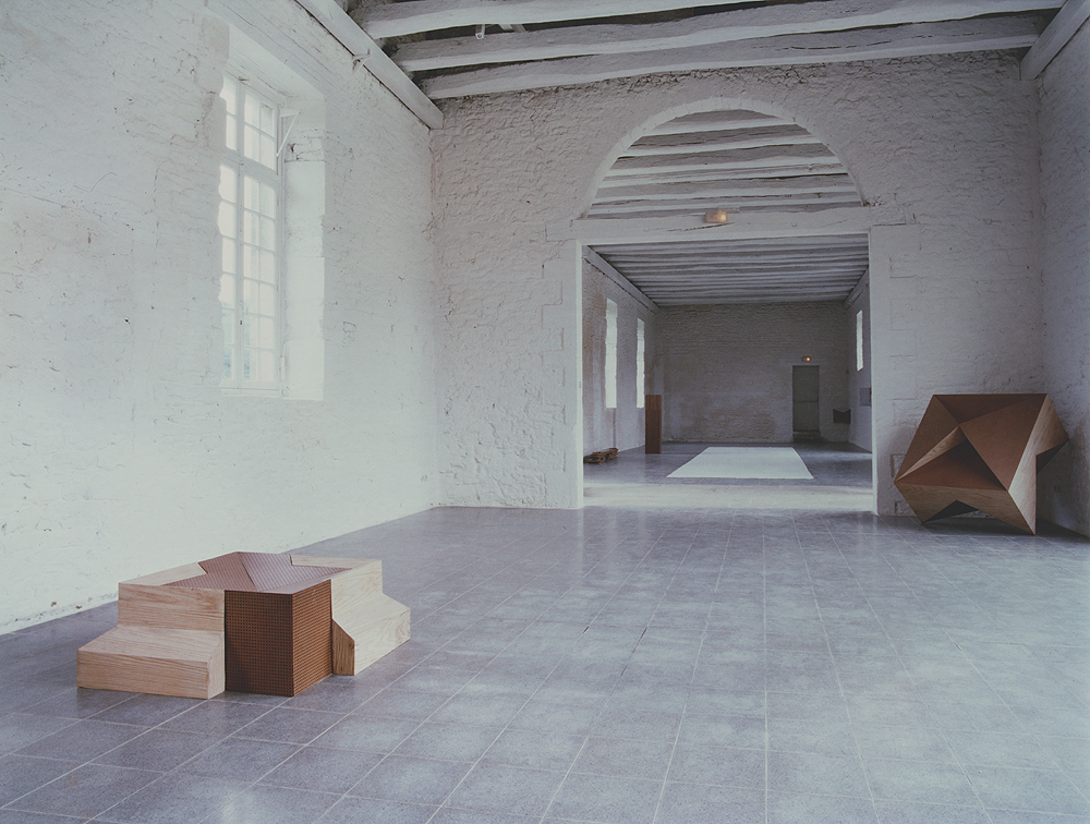 This concern for syntax already appears in all the works shown in 1988 at the Venice Biennale and called Ideas that the mind adds to those which are precisely signified by words. Each of the pieces making up the show was named by a fragment of this phrase – hence ideas, a sort of suspended niche bounding an unoccupied space (borrowing from an interior arrangement observed at a friend’s, somewhat in the same way that Jeanne, in the following year, included a Neapolitan colander in his composition), or by words, a large volume of black wood of complex shape, a combination of circle and quadrilateral prolonged by a curtain of walls. The sequencing of the works was this clear by itself, but generated a sort of enigma. Throughout this passage, we were given to read a saying by Diderot on geometry (to those which are precisely signified) and the viewer understood more or less confusedly that these four sculptures were intended to be organized according to an abstract tale. As in ancient arts of memory, which enabled a speaker to advance within his own speech like a visitor discovering the different parts of a house, something indicated here a family relationship or a complicity between the space and the language.