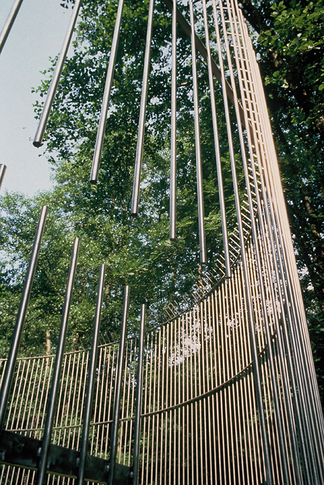 A group of five meters high rods is placed vertically in a circle eleven-fifty meters across. The rods are welded together with four flat-sided iron rings, which are attached horizontally at four different levels. The sculpture immediately suggests a cage. A door that is cut into the rods closes very quietly by itself as soon as one has gone through it. The grass in the clearing grows both inside and outside the circle. The first time I saw this place, there were beautiful cobwebs covering this clearing that no one ever walked through.