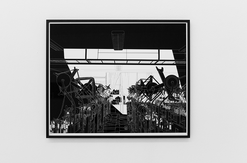 Je documente régulièrement ce que j’observe dans les usines que je visite. Je prends une photo pour retenir ce que je vois quand je pénètre dans un atelier de travail, une salle après l’autre. Il y a l’espace, la lumière, les machines, les productions. Mais aucune présence humaine. Ces photos sont pour moi des relevés. Elles ne sont pas de bonne qualité, mais je sais dans quel atelier textile chacune a été prise, et ce qu’elle représente. Je ne connais pas avec précision les outils de travail en place, leur mécanique, ce qui m’intéresse c’est le lieu dans son vécu, son intériorité. Ce sont ses traces, ses empreintes, ses vestiges qui vont constituer le matériau de ma recherche.