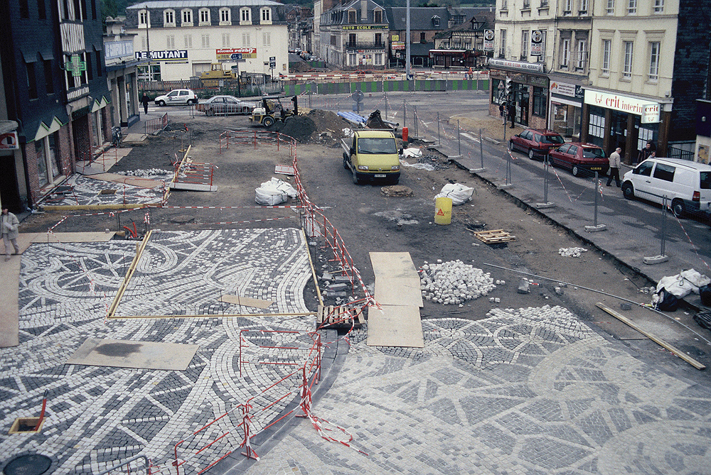 Pont-Audemer se trouve au cœur de la campagne en Haute-Normandie, le pavement évoque la prolongation d’une nature proche et familière, pourtant invisible de cet endroit de la cité.