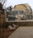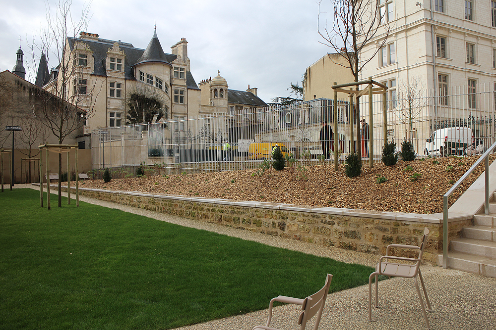 Depuis la rue, la grille trouble la déambulation mais également la perception du territoire qu’elle referme et auquel elle donne accès. On voit très bien le terrain au travers des barreaux. C’est un jardin public. La diagonale de la grille accentue le caractère composite des trois ou quatre niveaux qui descendent vers le fond du jardin. Le jardin communique avec la rue par une rampe en pente douce qui longe la grille ou par une volée de marches face à l’entrée, avant de se déplier un peu plus bas en 3 paliers de faible dénivellation. Le jeu des niveaux constitue l’essentiel du paysage car le jardin est dégagé, à l’exception d’une sculpture verticale de Didier Marcel, et des rares arbres qui s’y dressent jusqu’à l’aire de jeux pour enfants conçue par Pierre Joseph, étendu le long du mur du fond, à une vingtaine de mètres de la rue. Aux différents volumes de l’urbanisme alentour - bâtiment municipal restauré, habitations, murs - répondent ces plans aménagés du jardin, dont l’articulation semble répondre à la déviation de la grille. Ce territoire investi au milieu d’un décor urbain parfaitement restauré et entretenu, fait délicatement bouger l’horizontale en planchers successifs. Le projet du jardin – car rien, visiblement, n’a été décidé au hasard - introduit dans la solidité et la stabilité de l’espace fonctionnel un rappel subtil des mouvements dont le sol est capable et dont tout paysage est le résultat. Les dénivelés représentent la définition élémentaire du « paysage » : une disposition des strates géologiques en volumes et surfaces.