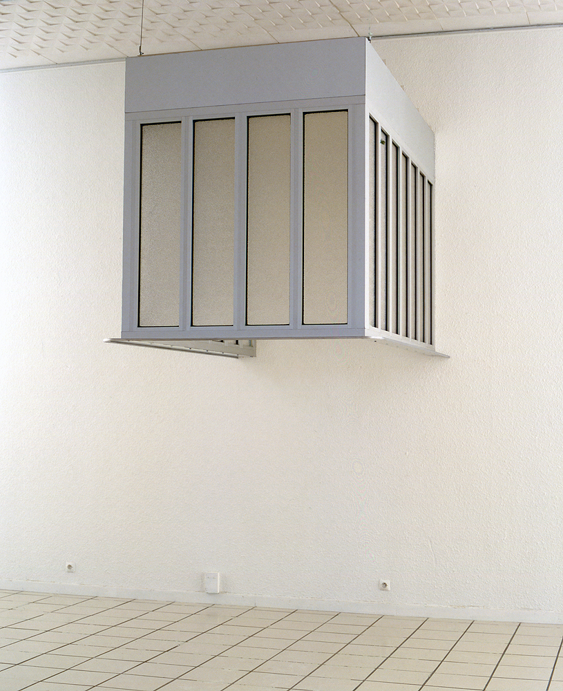 Des idées has the exact shape and size of a hood seen in the kitchen of a château. The stove was in position below it, and I had the irresistible urge to get underneath it, which is why I rebuilt it. Fixed to the wall just above the level of the viewer’s head (the sculpture sticks out from the wall at a height of one metre eighty from the floor and is also attached to the ceiling. This piece delimits the protective space below ; the light is pleasantly filtered by panes in polycarbonate. Without a doubt, under this hood, ideas will come to visitors, notably as regards the space they can see around them. But I can also – and no doubt more appropriately, because its position on the wall very much encourages me to do this – take up position under it and observe what circumstances decided to put there. This work is the first in the series of enclos (enclosures) to which Bande à part (2000-2002) belongs. I had a rather vague idea of the relation between the two pieces : two spaces that are clearly visible but not accessible, one above our heads, the other on the floor.