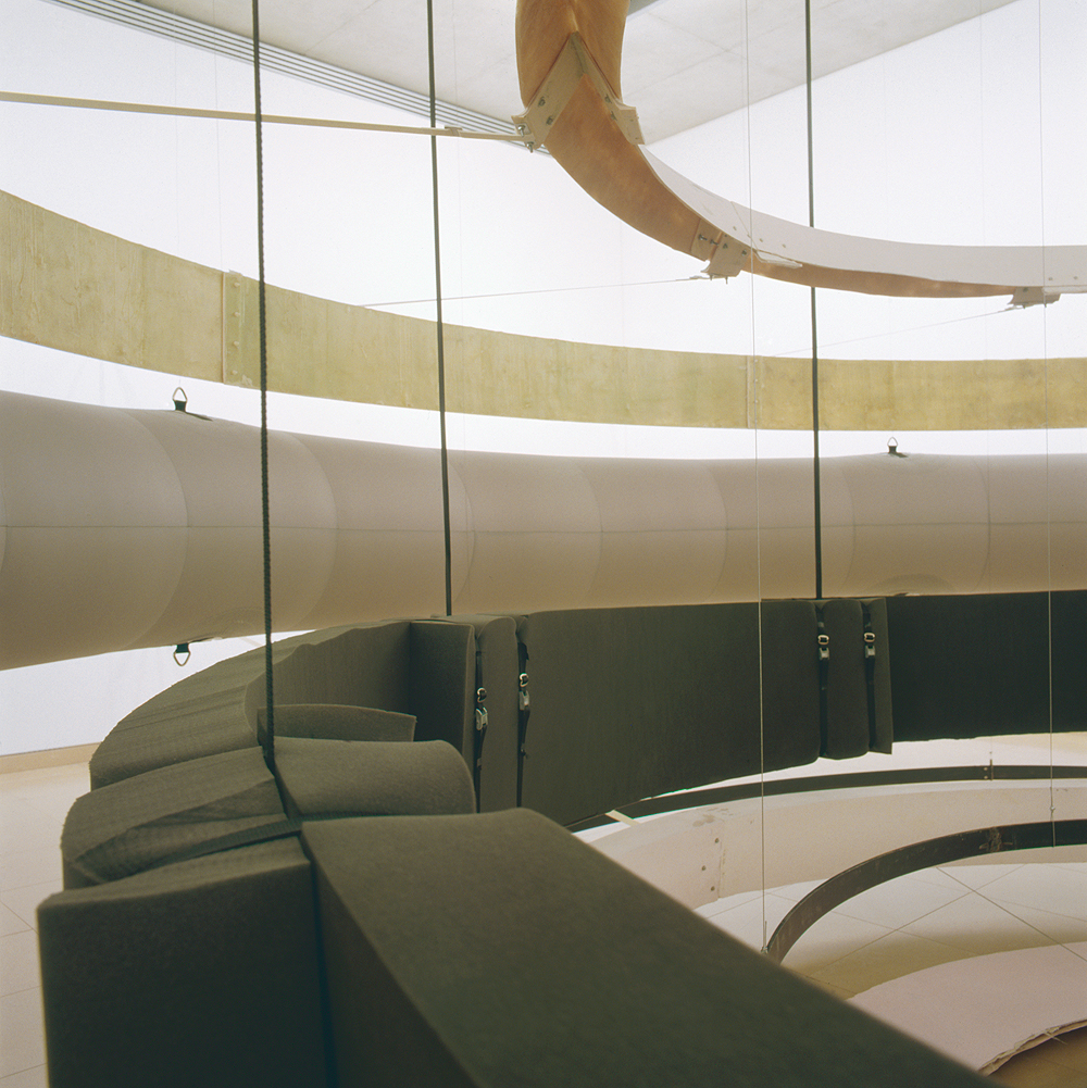 The cylindrical form of Two Edges stems from the vertical assembly of a series of nine circles of different sizes, different materials and drawings. The rings are suspended in mid-air, field in the centre of the space by steel cables, or by straps stretched to the four corners of the walls of the space containing them. Each ring should be seen as an independent part of a sculpture, which is added to the part situated above. The parts are differentiated by the materials with which they are made : resin, because it can be used to make round shapes, solid steel rings, black foam mattresses forming a circle, and last of all, the largest of them all is the one which is placed level with the onlooker’s chest, pushing him backwards. This is an aerated grey plastic structure (inside which a motor expels air so that the tube is being constantly inflated). If you touch the surface of the plastic, you can feel the air circulating, and a slight humming can be picked up, caused by the exhalation.