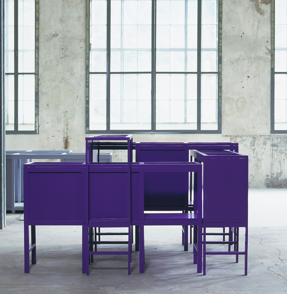 This sculpture was constructed on the basis of a particularly sophisticated detail in BCHN : two corridors out of four intersect, with one passing over the other, while the floor at this point is levelled. As the representation of a loop drawn with a marker, the four corridors B.C.H.N. were conceived as a sculpture distinct from the architecture, that is to say, an object in three dimensions positioned in space. Fabrique II is a dense and dynamic sculpture that is very complex to assemble. Its principle is simple : it comprises four modules of equal length (151 cm) and width (37 cm), but of decreasing height (115 cm, 107.5 cm, 99.5 cm, 92 cm). Raised height-wise, on piles, the sections overlap and define an empty square at the centre. When assembled, it is one 115 centimetres high, 188 centimetres long, 151 centimetres wide. The wood is painted purple. The colour purple is hard to relate to natural things ; too intense, it is rarely allowed in an apartment. The sculpture pushes space back around it : the complex organisation of the structure of interlocking corridors in a compact pattern and the choice of bold, bright colour both contribute to this.