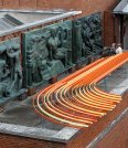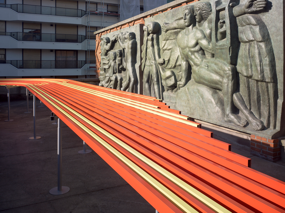 To conceive a sculpture in this densely packed place, I was looking for a space that would allow the imagination to circulate within the area of Antoine Bourdelle’s studio, which, over time, has turned into a museum. In the garden, cluttered with all sorts of sculptures, I thought I could play on the picturesque, lightness, tininess – all terms that represent quite a challenge. But the narrowness and complexity of the areas are very constraining. The more I thought about it, the stronger my feeling that I wanted to get away from the museum ; I needed a concrete space that was clearly delimited. That is why I decided upon the outdoor terrace over the garden and street. From there you have an extensive view of the roofs, like a springboard to the sky. Although limited, with a building blocking the view, the terrace overlooks the museum and is also the only clear space, even if in reality it is a dead end. This narrow but obstacle-less configuration encouraged me to imagine a sculpture that would allow viewers to ‘take off’. On the brick wall running along the belvedere there is a big bas-relief comprising three panels, entitled ‘The Muses Running to Apollo’. The work’s title contains the notion of movement and there is an evocation of dancing along the terrace. At the same time as I was looking for space in the museum, an exhibition about Isadora Duncan was showing documents in the form of photos, silent films of the dancer, her stage costumes, various objects, drawings and also some strange dancing sculptures ; grace and lightness were shown in the museum within the very collection of bronze and marble sculptures by Bourdelle. Drawing emerged as a tool for conceiving a sculpture suggesting flight or a line of escape, an effect heightened by the closeness of the bas-relief. In sculptures I try to express a place that is the springboard for an imaginary and fragmented story, with the sculpture as a means of escape, and the terrace as a runway. Since my recent works Eyeliner (2007) and Road Movie (2008), roads have been a recurring feature of my works. Sculptures, like roads, are the means I choose to express my desire for freedom : to me, they are replete with possibility. On the site, I dreamed of somewhere beyond the place ; little by little a story was built and one image followed another, making a path to run on. I thought of dance steps, then steps only, and finally I thought of the imaginary tracks left by the tail lights of cars driving side by side on a motorway at night. I wanted to make perceptible these effects of excitement and breaking free caused by speed. The red and yellow of lights indicate overtaking. Sixteen 12-metre-long red lines and fifteen yellow ones 6 or 12 metres long follow or chase one another. The yellow parallel bars are put underneath, or next to the red bars, and then they are all arched, forming a bend that widens to the left of the central axis, this being clearly marked by a strictly regular alignment. This arrangement of the lines is made uncertain by the visitor’s movements, depending on where they are standing in relation to the sculpture, or on the side ; the bars are narrow and thick (25 millimetres thick by 50 millimetres high), and so as the visitor moves away from the central axis of the sculpture, they can see it getting thicker, and the red and yellow colours are more or less visible. The drawn lines, whose regularity and simplicity I wanted to convey a feeling of harmony, now acquire the notion of speed (doubling of certain lines) and colour (bright red and yellow). I wanted to create the sensation of gaining speed, just as you do before taking off.