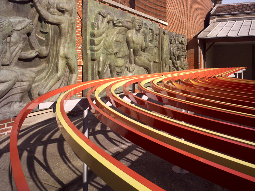 Pour réaliser une sculpture dans cet endroit lourdement chargé qu’est l’atelier d’Antoine Bourdelle devenu avec le temps un musée, je recherchais un espace capable de faire circuler l’imaginaire. Dans le jardin encombré de diverses sortes de sculptures, je pensais pouvoir jouer le pittoresque, la légèreté ou le minuscule, tous ces qualificatifs représentant plutôt un défi. Mais l’étroitesse et la complexité des parcelles sont très contraignantes. Plus j’y pensais, plus se dégageait une sensation précise de désir de fuite hors du musée ; j’avais besoin d’un espace concret précisément délimité. C’est pourquoi j’ai opté pour la terrasse extérieure dominant le jardin sur rue. De là on a une vision étendue sur les toits, tremplin vers le ciel. Bien qu’entourée de limites avec une vue bloquée frontalement par la façade d’un immeuble, la terrasse surplombe le musée ; c’est aussi le seul emplacement dégagé même s’il se traduit en réalité par une impasse. Cette configuration étroite mais sans obstacle m’a encouragé à imaginer une sculpture qui entraîne une sorte de « décollage » du spectateur. Sur le mur en brique longeant le belvédère est installé un grand bas-relief en trois panneaux intitulé Les Muses accourent vers Apollon. On trouve dans le titre de l’œuvre la notion de mouvement et une évocation de la danse le long de la terrasse. Simultanément à ma quête d’espace dans le musée, une exposition sur le thème d’Isadora Duncan présentait des documents sous la forme de photographies, de films muets de la danseuse, ses vêtements de scène, des objets divers, des dessins ainsi que quelques étranges sculptures dansantes ; la grâce et la légèreté étaient montrées au sein même de la collection des sculptures en bronze et en marbre de Bourdelle. Le dessin s’est imposé comme outil pour concevoir une sculpture suggérant une trajectoire de fuite que la proximité du bas-relief a accentuée. Je cherche à exprimer dans la sculpture un lieu à partir duquel un récit imaginaire et fragmenté s’invente, la sculpture comme moyen d’évasion et la terrasse comme piste d’envol. Depuis les pièces Eyeliner (2007) et Road Movie (2008), la route revient de façon récurrente dans mes travaux. La sculpture et la route sont les moyens que j’ai choisis pour manifester mon désir de liberté, elles m’évoquent tous les possibles. Sur place, j’ai rêvé à un au-delà du lieu, un récit s’est construit peu à peu, et les images se succédaient en un chemin à parcourir. J’ai pensé aux pas de danse, puis aux pas tout court, puis aux traces imaginaires que laissent les feux arrière d’automobiles roulant côte à côte sur une voie rapide la nuit. Je voulais que se perçoivent ces effets d’excitation et de dégagement que provoque la vitesse. Le rouge et le jaune des feux clignotant pour avertir d’un dépassement. Seize lignes rouges de 12 m de long et quinze autres de couleur jaune de 6 et 12 m se suivent ou se poursuivent. Les barres parallèles jaunes sont placées en dessous ou à côté des barres rouges, puis toutes sont cintrées, provoquant un virage élargi à gauche de l’axe central bien marqué par un alignement strictement régulier. Cette disposition des lignes est brouillée par le déplacement du spectateur selon qu’il se trouve à un point ou à un autre de la sculpture ou sur le côté ; en effet, les barres sont étroites et épaisses (25 cm d’épaisseur pour 5 cm de hauteur) : aussi, dès qu’il se décale de l’axe central de la sculpture, il la voit s’épaissir, les couleurs rouges et jaunes plus ou moins visibles. Aux lignes tracées par lesquelles je recherchais à travers la régularité et la simplicité, le sentiment d’harmonie, se sont ajoutées les notions de vitesse (doublement de certaines lignes), puis de couleur : un rouge éclatant et un jaune vif. Je voulais que l’on ait le sentiment de prendre de la vitesse, pour un décollage en règle.