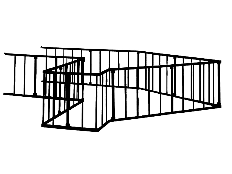Que l’esprit ajoute, a barrier in wrought iron that sets out contours in straight lines, broken off at a right angle or at variable angles, is attached to a wall by two rings ; it is indissociable from the wall, but the space that it occupies is not definite. Definition of the work as enclosure, a space enclosed by a surrounding. It is the first in a series that develops by repeating itself. Bande à part (2000-2002) reprises its geometrical configuration ; as for the material, very thick aluminium tubing takes the place of wrought iron.